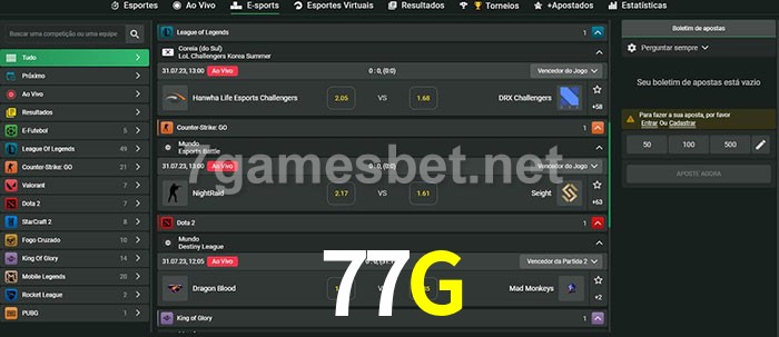 O 77G oferece uma grande seleção de opções de apostas em e-sports com probabilidades competitivas